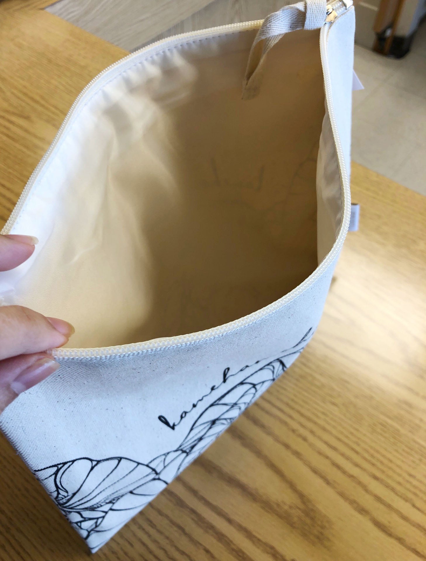 Natural, zippered, lined, 12"W x 10"H